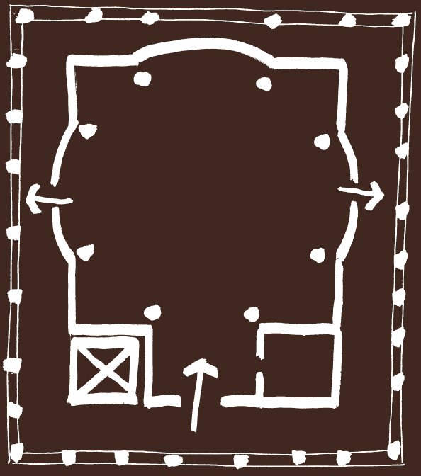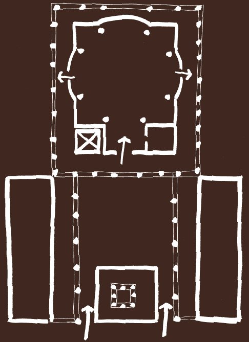 | L'ottagono rappresenta l'ottavo giorno, cioè il giorno della redenzione, la vita eterna, di cui i fedeli hanno un anticipo nel centuplo in questo mondo. Il cerchio sul quale è costruita la chiesa ha un raggio di 12 metri, e il 12 (numero simbolico che rappresenta le tribù di Israele, i dodici Apostoli, le dodici porte della Gerusalemme celeste) è il modulo che sta alla base delle misure di tutte le singole parti della costruzione. | ![]() |