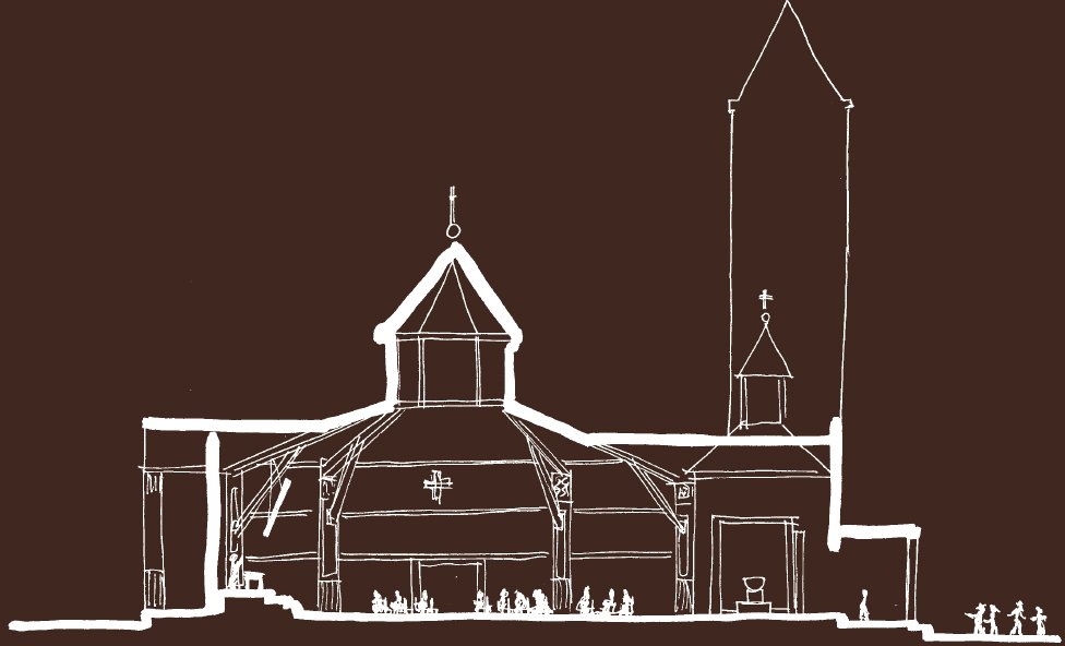 La scommessa di Cesare e Dario, nel progettare la chiesa, è quella di riuscire a rendere visibile il significato delle cose, a far presentire il Mistero di Dio che si fa uomo. Per questo nulla è stato lasciato al caso: forme, colori, elementi architettonici non hanno una valenza puramente estetica. La pianta riprende un quadrato (simbolo della terra, dell'umanità) che si compenetra nel cerchio (simbolo di Dio), a rappresentare l'incarnazione, il Dio che si fa uomo in Cristo Gesù. Negli otto punti di intersezione tra il cerchio e il quadrato sorgono altrettante colonne (simbolo degli apostoli) che sorreggono la copertura. | ![]() |