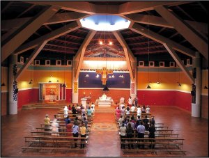 All'interno trionfano i colori, il segno della festa del popolo cristiano che si raduna per celebrare l'eucarestia. |
