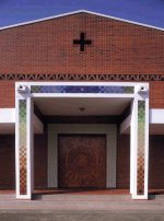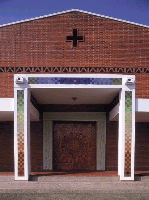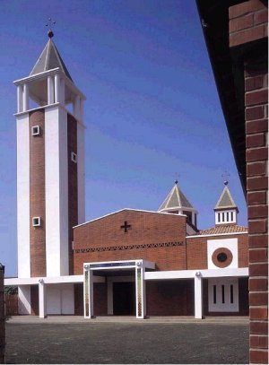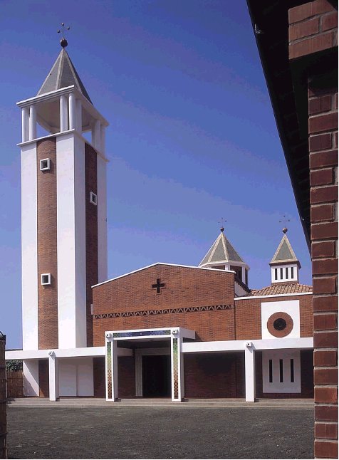 All'esterno la chiesa è bianca, e rossa di mattoni a vista. Si distingue da tutto ciò che la circonda, grazie al colore simbolico della festa. Gli inserti di colore, sulle cuspidi, sui pilastri all'ingresso, sono incastonati nel paramento bianco della festa. |